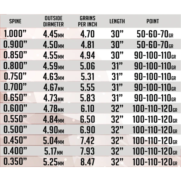 | SPINE | OUTSIDE DIAMETER | GRAIN PER INCH | LENGTH | RECOMMENDED POINT |